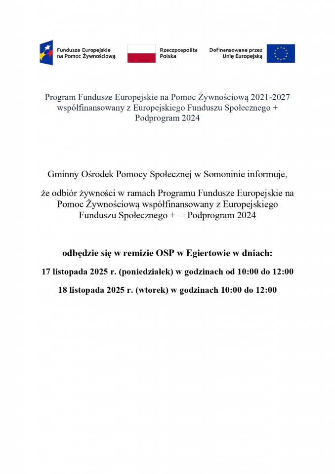 Zapraszam do obejrzenia strony „Program Fundusze Europejskie na Pomoc Żywnościową XI 2025 odbiór remiza OSP Egiertowo - Program Fundusze Europejskie na Pomoc Żywnościową XI 2025 odbiór remiza OSP Egiertowo”